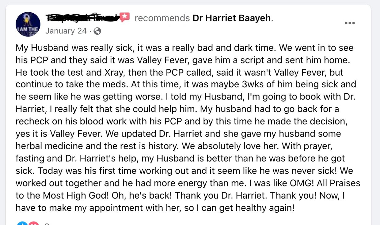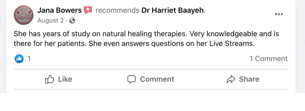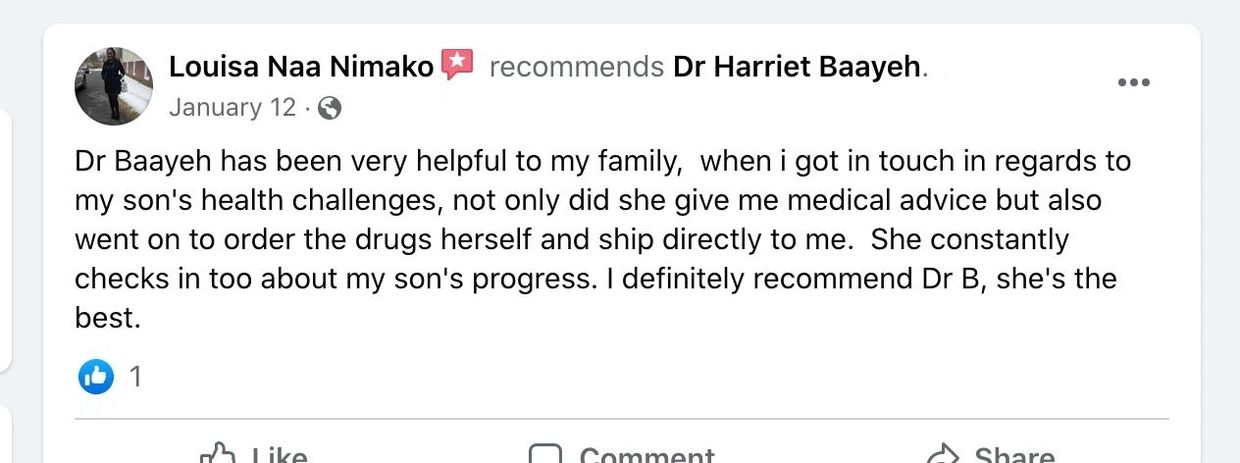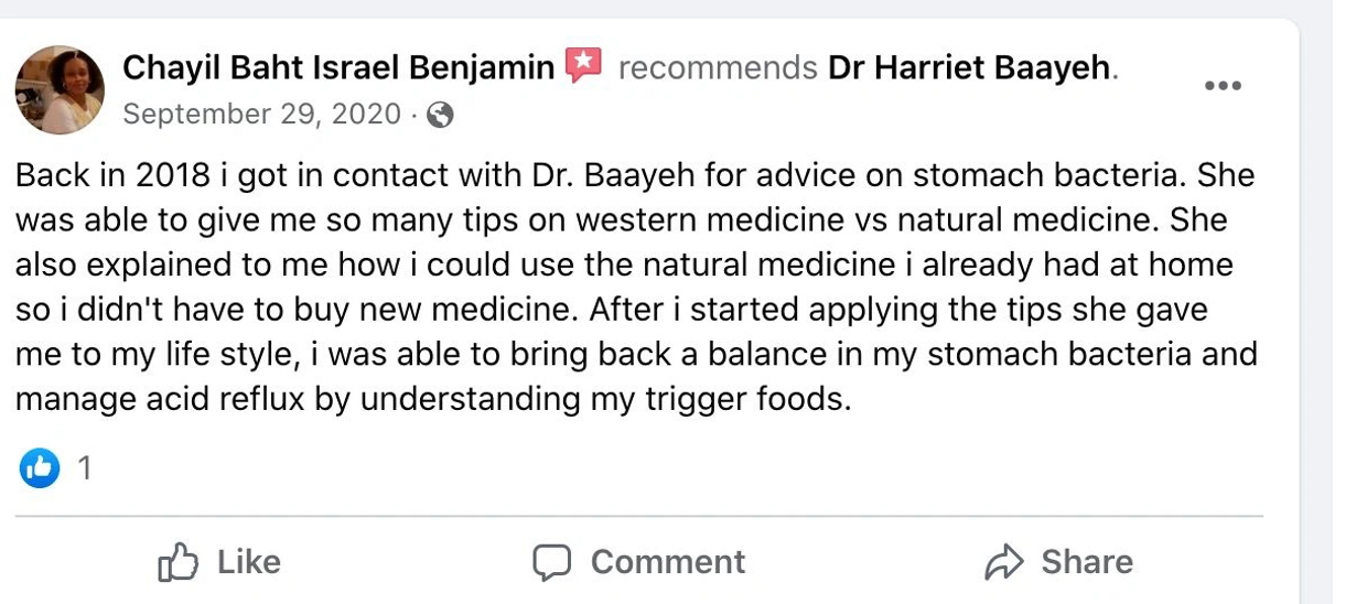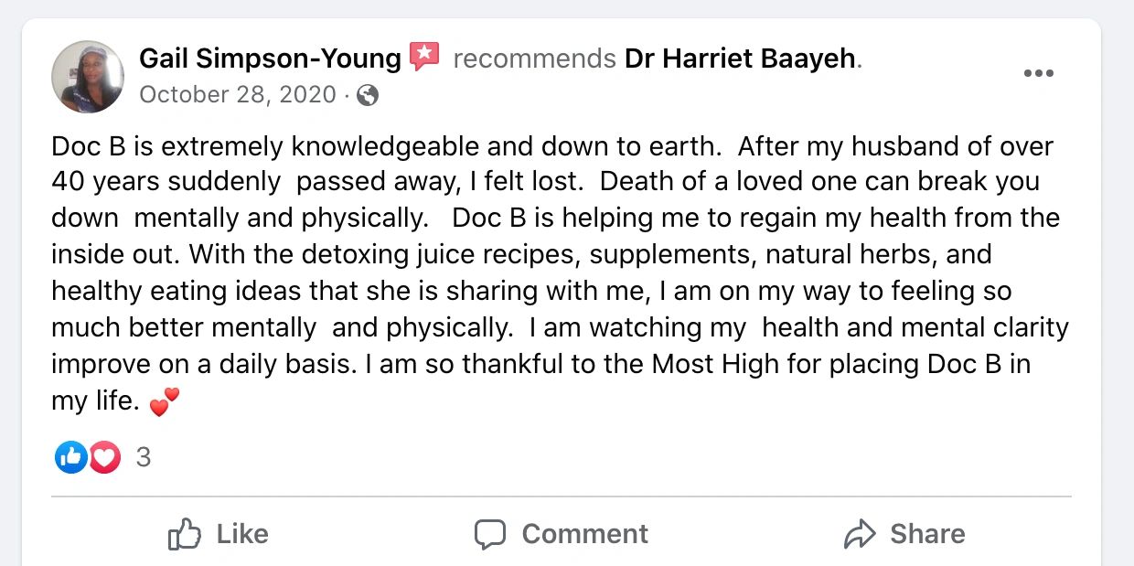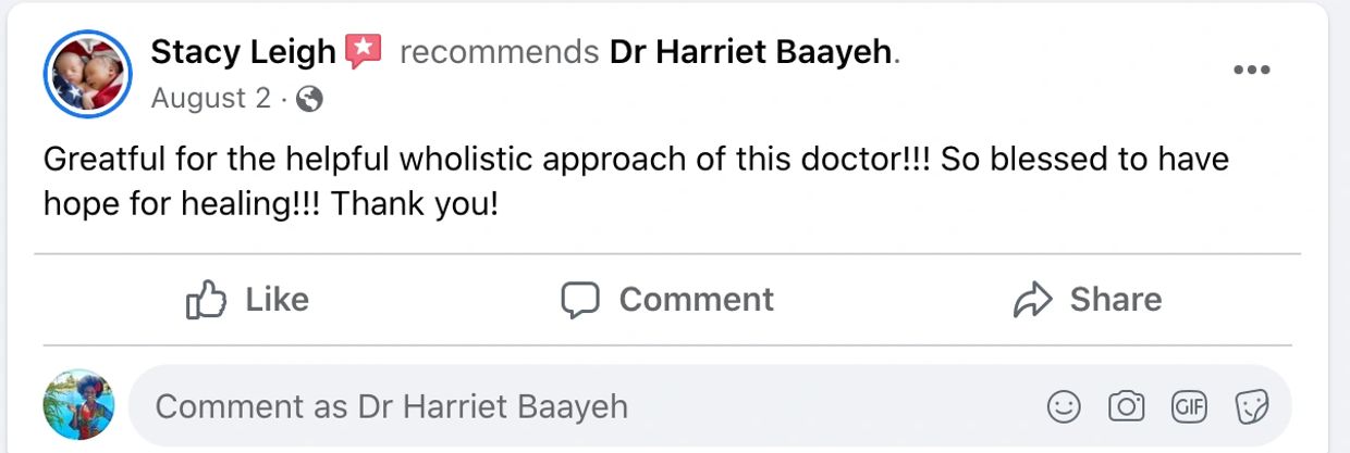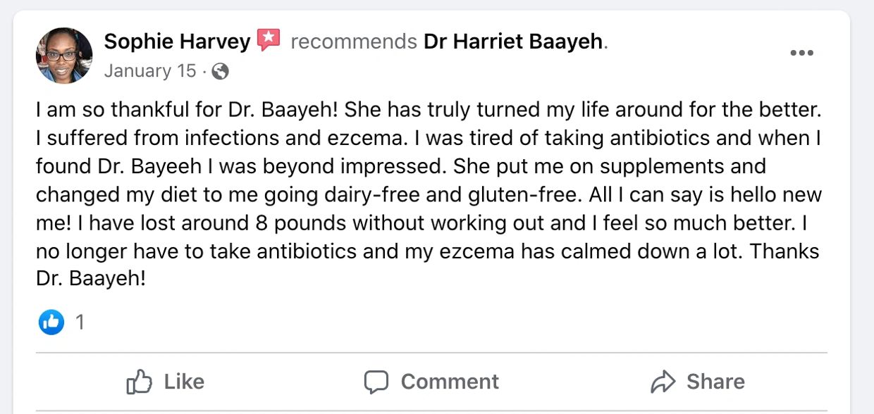 “My first visit with Dr Baayeh was very thorough and refreshing. My condition before meeting Dr. Harriet was horrible. I struggled tremendously with my weight, and I was getting sicker every day….No matter what I did, I couldn’t get better or feel better. Dr Baayeh has completely changed my life and has continued to guide me in my wellness journey.
